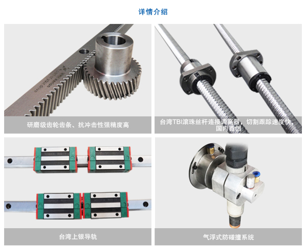 ◆三軸運動采用進口高精度導軌、斜齒齒條,伺服電機及減速機,使X軸鋁型材自行設計開發(fā)模具,保證設備運行過程中的穩(wěn)定性。